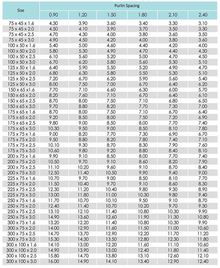 The purlin load table are derived in a accordance to BS5950 : Part 5 : 1987 “Code of Practice for Design of Cold Formed Section” with maximum roof pitch 30° and roofing sheet distributed load 6.55kg/m².