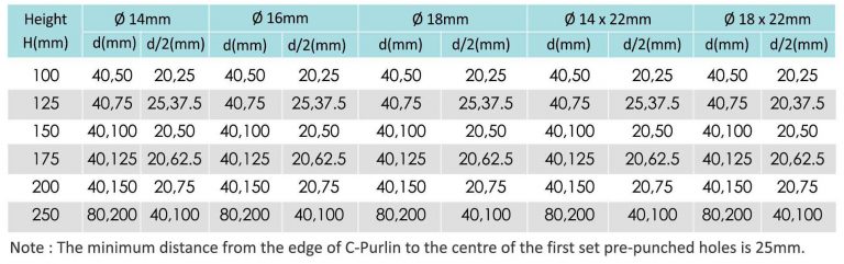 Galvanized C and Z-Purlins are manufactured in custom cut lengths. It can be supplied either with or without punched holes. If punched holes are required, the following are pre-punched holes arrangements and option.